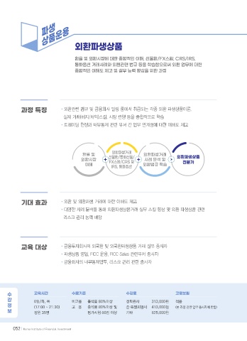 과정 특징 •외환관련 법규 및 금융회사 딜링 룸에서 취급되는 각종 외환 파생상품이론,